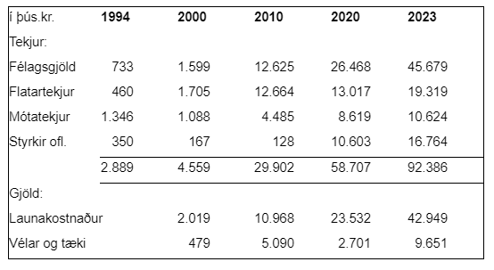 Fljótlega breyttust þó tekjustofnanir. Félagsgjöldin hafa alltaf verið að styrkjast sem tekjustofn og svo bættust við tekjur af mótahaldi og flatargjöldum. Þessir tekjupóstar voru á fyrstu árunum oftast u.þ.b. jafnir eða með um þriðjung hver.